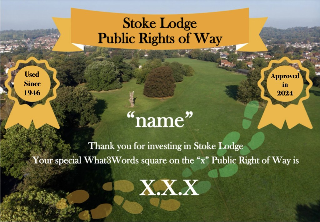 Just as for the other squares on our map, the donation is at your discretion, if you want a square that falls on one of the footpaths simply make that request when you email We Love Stoke Lodge. Your certificate will be similar to that pictured here rather than the one above, printed for collection or delivered electronically.