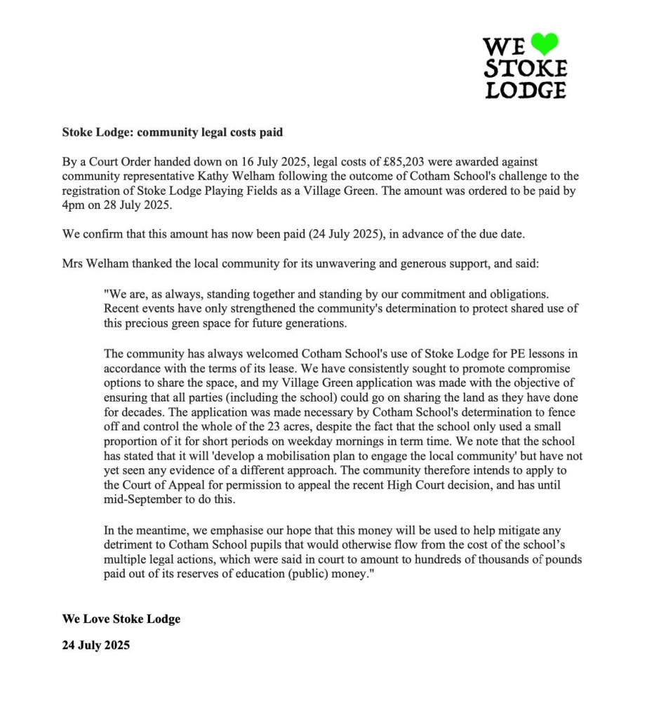 The appalling & virtually unprecedented decision by the judge in the Stoke Lodge TVG case to apportion costs 10% to the council 90% to 2nd defendant and TVG applicant as requested by Cotham School left a pensioner with an £85k bill because she was excluded from cost-capping talks.