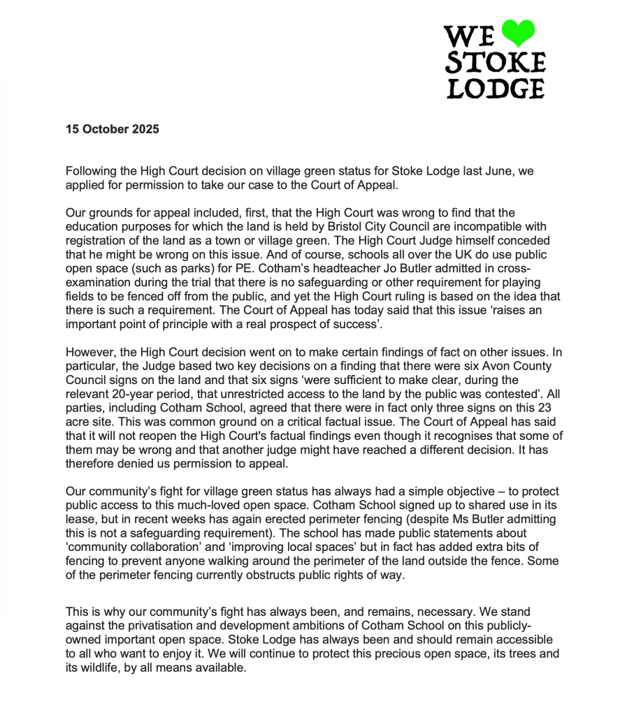 As of autumn 2025, Cotham School leadership are still fighting us – they have taken to the courts to get the TVG (Town or Village Green) registration overturned and have challenged the registration of the public rights of way on the Definitive Map agreed by the Public Rights of Way and Greens Committee in November 2024. While it’s not legally a village green, it is just that in every other sense of the word and still there for all to enjoy.